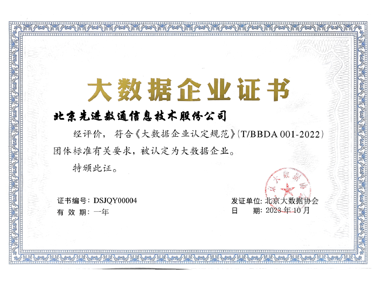 • 大数据企业证书
